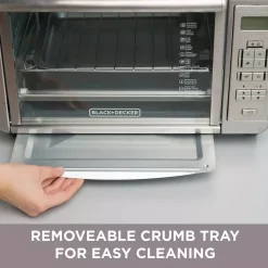 At-home cooking just got easier with the BLACK+DECKER 6-Slice Stainless Steel Digital Convection Countertop Toaster Oven with Broiler Pan. With a large interior and 20% faster cooking times than previous models, the seven dedicated cooking functions quickly perfect everything from 12pizzas to reheated leftovers. Intuitive digital controls make it easy to set the time, temperature, and cooking function, and the 120-minute timer features stay-on and auto-shutoff functionality. Convection technology circulates air within the oven for fast and even results while baking. Plus, the toaster oven includes a broiler pan and an external crumb tray that slides in and out, making cleanup a breeze. When its time to eat, trust the #1 brand in toaster ovens BLACK+DECKER. Compared to BLACK+DECKER TO1660B. Three rack positions bake an entire chicken or finish steaks right under the broiler. The included rack slides in to three different positions for flexible cooking. Bake/broiler pan donβt worry about finding pans to fit in the oven. The included baking/broiling pan fits perfectly, making it easy to insert and remove food. Toasting rack also included.