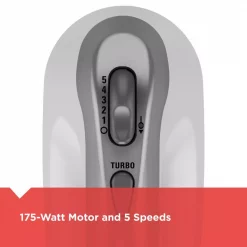 With this revolutionary and new lightweight ergonomic design, take control of your mixing. The first speed has been improved to produce less mess, which along with the dish washable parts, provides you with a no fuss clean up. By pushing the Power Boost button you can increase the mixing power then release it to continue at normal speed. Convenience is at your fingertips with the heel and bowl rests as they make it easy to set the mixer down and prevent dripping between tasks.