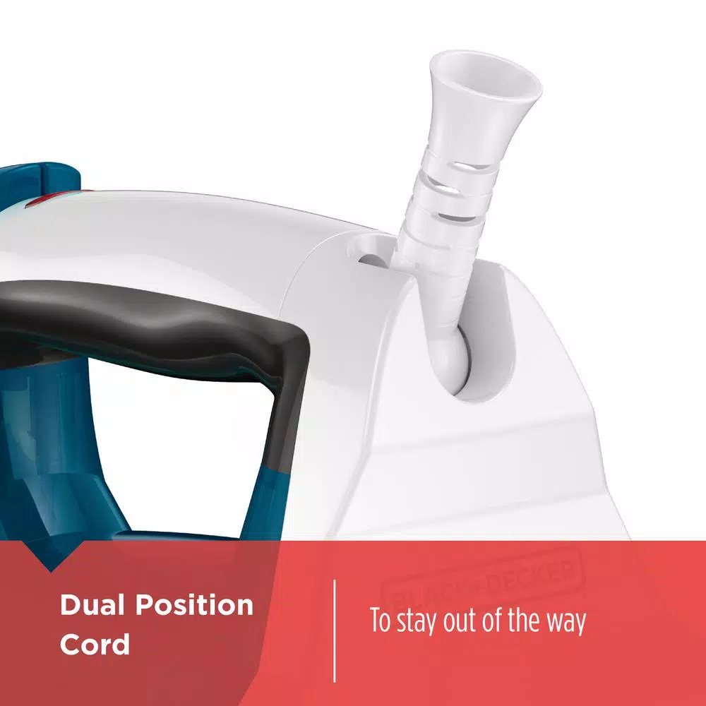 - Dual position cord: the cord is designed to toggle down so it stays out of the way while you iron.