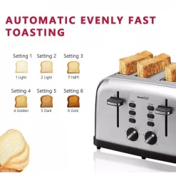 4 slice toaster provides 6 brownings for you, from light to dark according to your taste. Toasting Evenly and Fastly. Multiple toasting modes with LED indicators fit all of your toasting needs, defrost can toast things that are still frozen. The bagel feature adds extra time to the toasting cycle to allow for thicker bread. Cancel for stopping all toast task. Hope it can bring you a easier and tasty breakfast!