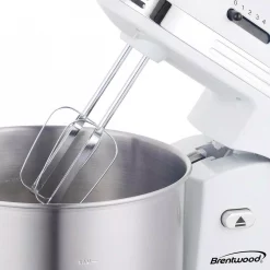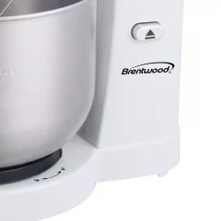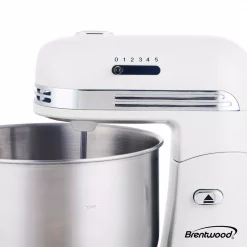 Use the White Brentwood Appliances 5-Speed Stand Mixer with 3-Quart Stainless Steel Mixing Bowl to mix, beat, whip and aerate eggs, batter, dough and more. It includes both beaters and dough hooks. 5 variable speeds allow you to create thick to thin consistencies. It boasts an easy to store, lightweight, compact design. The stainless steel bowl locks securely into the base and is dishwasher safe.