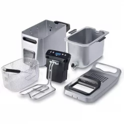Enjoy crispier and tastier food with the De’Longhi Dual Zone 3.0 lb Deep Fryer. The extra large capacity makes feeding the entire family a snap. You can avoid lingering odors with the unique dual zone technology, which provides a cool zone of oil to catch fallen pieces and prevents them from burning. The patented easy clean draining system helps combat the dreaded messy oil cleanup afterwards; simply pull out the hose stored in the front of the fryer and drain the oil. If you’re not sure when it’s time to drain the oil, no worries, the oil cycle counter will tell you, guaranteeing fresh taste every time you fry. The permanent stainless steel filter, removable heating element and dishwasher safe parts will also help with the easy cleanup and odor protection. If your kids like to help with the cooking you can feel safe using the fryer with them around thanks to the magnetic cord that easily detaches from the fryer if accidentally pulled. For added safety, the patented condensation shield prevents oil from dripping onto the cord connection. For perfectly fried food every time, use the precise digital timer and adjustable thermostat. Other highlights include windowed lid and outer cool touch handle.