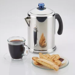 Brewing coffee on the stovetop extracts a fuller, richer flavor, and this Farberware Stainless Steel 12-Cup Stovetop Percolator is ready to brew up a dozen 4 oz. cups of your favorite java. Farberware has been trusted for over 100 years, and this percolator continues that tradition for a new generation. The heavy-duty stainless steel is polished to a mirror finish for a classic touch with a delightful blue glass knob and the sleek and traditional look fits in with any kitchen decor. A comfortable handle with iconic styling offers a confident grasp and is designed to provide a balanced grip while pouring delicious French roasts or flavored coffee blends. A non-reactive interior keeps water from absorbing any undesirable odors or tastes. And, with a permanent filter basket, theres no need to deal with messy paper filters. A tight-fitting lid seals in heat and the sturdy, see-through blue glass knob lets you know when percolating begins. Fully immersible and dishwasher safe (glass knob and pump tube spring excepted), this percolator makes a great addition to any of the Farberware collections.Get back to basics, and enjoy more flavorful coffee, using the Farberware Classic Series Stainless Steel 12-Cup Stovetop Percolator.