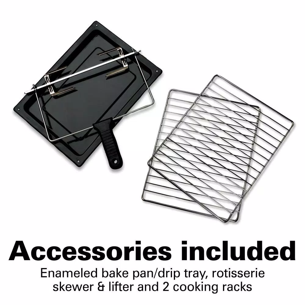 - Includes enameled bake pan/drip tray, rotisserie skewer and lifter and 2 cooking racks