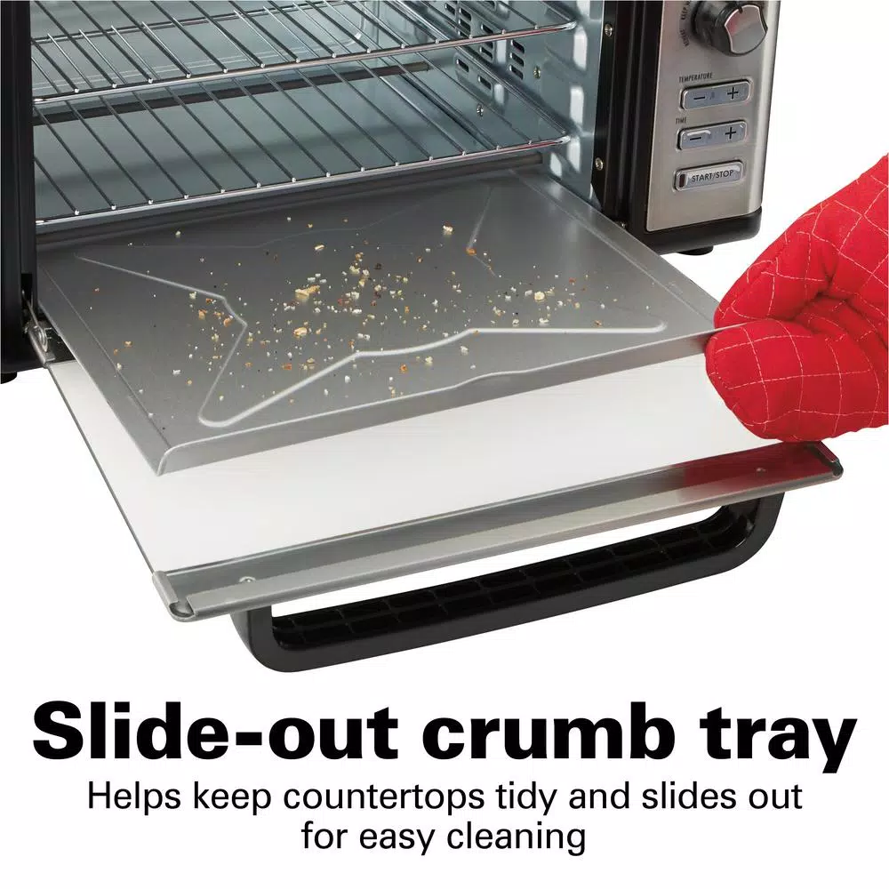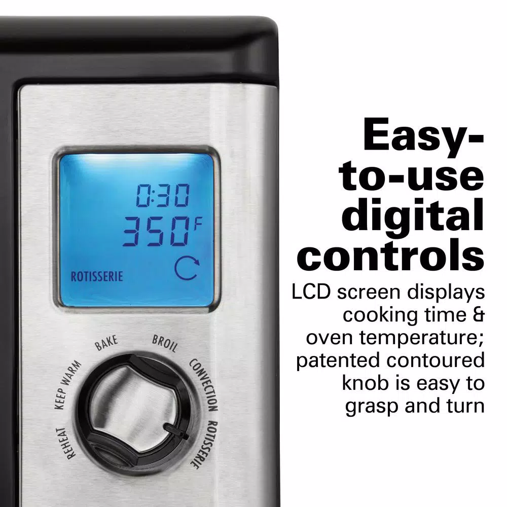 Designed with style and practicality in mind, the extra-large Hamilton Beach Digital Oven with Rotisserie is packed with all the space you need for cooking familly meals and desserts year round. Six digital cooking functions including convection, bake, broil, reheat, keep warm and rotisserie let you easily switch from baking casseroles or broiling salmon to preparing two 12β³ pizzas. The intuitive digital controls make it easy to select your cooking function, time and temperature and the LCD screen displays the current temperature and remaining cook time. Inside youβll find four rack positions so you can adjust the two included cooking racks as needed or remove them entirely for preparing a rotisserie meal and cleaning. Includes enameled bake pan/drip tray, rotisserie skewer and lifter and two cooking racks.
