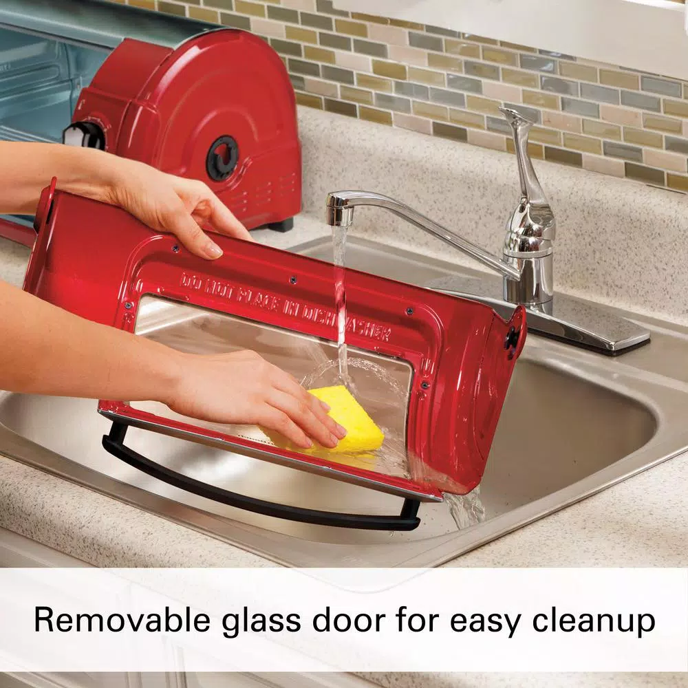 You wonβt find a design like the Hamilton Beach Easy Reach Toaster Oven with Roll-Top Door anywhere else. Its unique and large opening makes food easy to reach. And since the door opens above the oven, it frees up your countertop space in front. Best of all, itβs easy to keep clean because food canβt spill on the door. Contoured dials are easy to grip and turn, making it simple to switch between bake, broil and toast settings.The stay-on setting is safer thanks to a stop mechanism that prevents the knob from being turned to stay-on by accident. Sprinkle cheese on your pizza while itβs baking or safely grab toast in the very back without all the maneuvering. The roll-top door moves up and out of the way so you can have safe, easy access to your food before, during and after cooking. The Easy Reach Toaster Oven door rolls up, not down, making it easy to move food directly to your plate when itβs done. Melted cheeses, crumbs and juices are less likely to end up on the door because the door is never under the food rack, even when food is being removed or put into the oven. The roll-top door and the crumb tray are both removable for cleaning. The crumb tray easily slides out from the front of the toaster oven, instead of the bottom, making cleanup simple while keeping crumbs off the countertop. With 3 settings and a spacious interior, the Hamilton Beach Easy Reach Toaster Oven can accommodate the foods your family makes most.