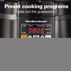 The Hamilton Beach Multi-Function Pressure Cooker with steam release button safely releases steam away from hands. In addition to fast pressure-cooking, the Hamilton Beach Multi-Function Pressure Cooker has True Slow technology, which gradually raises the temperature just like a traditional slow cooker to prevent overcooking so that slow cooker recipes come out just right. And it does so much more! Besides pressure-cooking and slow-cooking with confidence, the Hamilton Beach Multi-Function Pressure Cooker is also a rice cooker, steamer, and egg cooker and warmer, plus it sauts. It has preset programs for meat, poultry, rice, steaming, beans, whole grains, casseroles, eggs, and soup. The brown/saut button lets you add flavor to meals by browning and sauting food in the nonstick pot. Youβll find yourself using the Hamilton Beach Multi-Function Pressure Cooker for practically everything you cook, from perfect breakfast eggs to hearty one-pot meals for the whole family. The dishwasher safe pot makes cleanup easy.