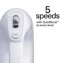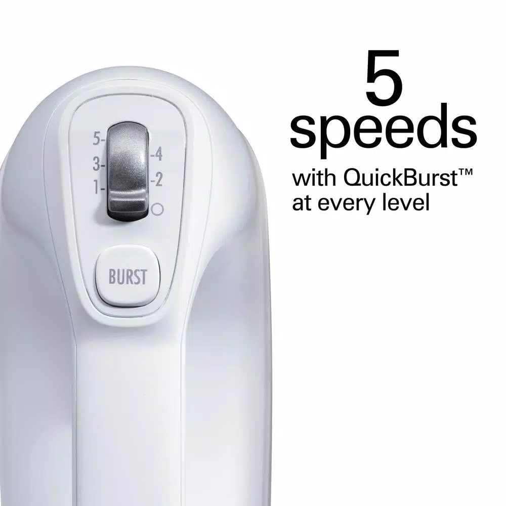 Whether itβs lighter-than-air whipped cream or chewy chocolate chip cookie dough, you can mix ingredients effortlessly with the Hamilton Beach Professional 5-Speed Hand Mixer. Lightweight and powerful, this mixer has a slow start that prevents splatters, no matter what youβre mixing. Push the QuickBurst button for an extra punch of power at any of the five levels. A lockable swivel cord, snap-on storage case and trigger-release makes mixing easy from start to finish. Powerful, Effortless Mixing From mashed potatoes to whipped cream, this professional-grade hand mixer gives you the power and control to mix and blend with ease.