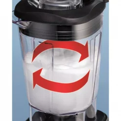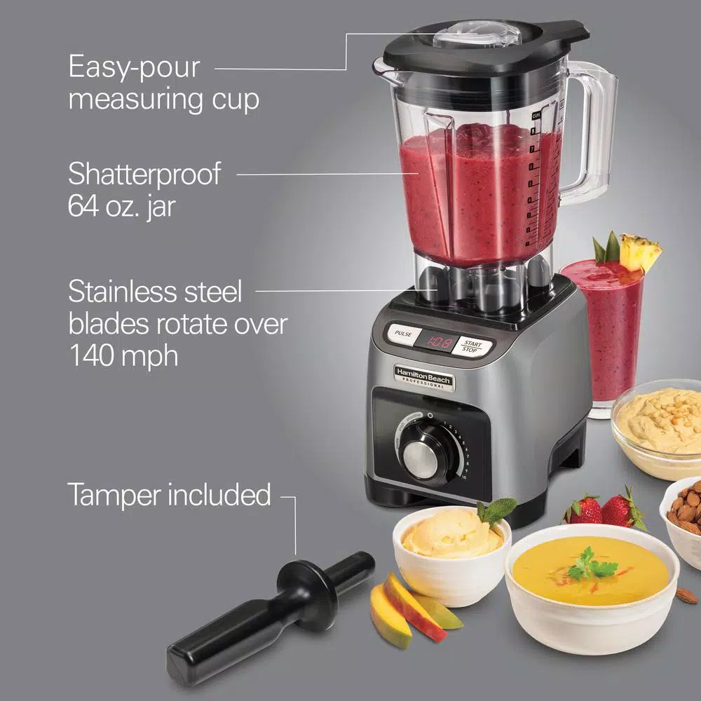 Take your blending power to the next level with the Hamilton Beach Professional Blender. With 1800 watts of peak power and a 2.4 peak horsepower motor, this blender reaches speeds of over 140 mph to blast through ice and other tough ingredients, fast. Built to last, the Professional Blenders motor is thermal-protected to prevent overheating, and the BPA free jar is shatterproof. Effortlessly create perfectly blended smoothies, juice whole fruits and vegetables, puree hot soups, emulsify dressings and grind grains. With a variable speed dial, you control the blending to achieve the exact consistency you want every time. Or choose pre-programmed smoothie, ice crush or puree settings for one-touch convenience. A tamper is included to help blend thick or frozen mixtures. The clean setting makes washing your jar a breeze, and all parts are dishwasher safe.