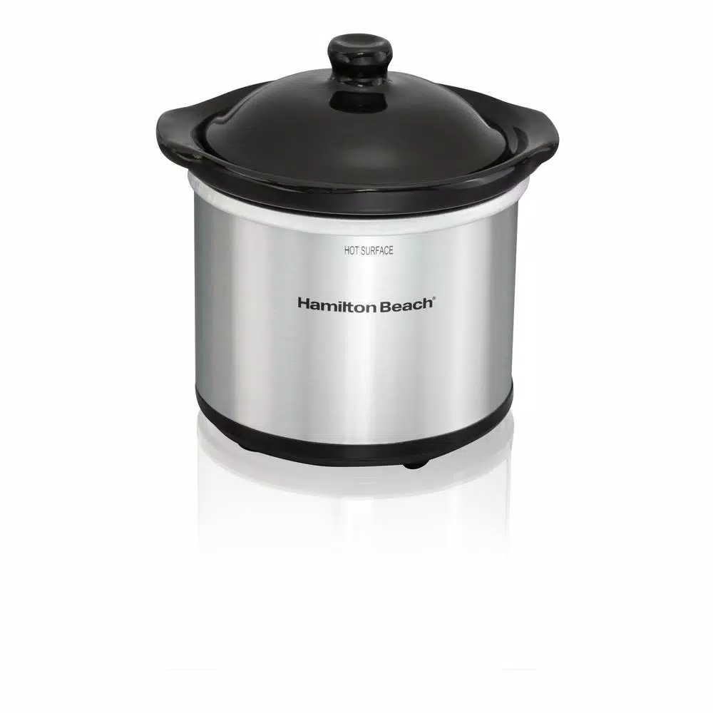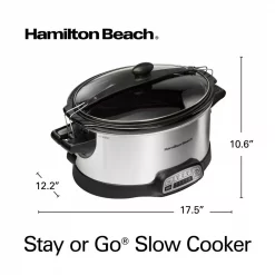 The Hamilton Beach Programmable Stay or Go Slow Cooker makes it easy and mess-free to travel with food thanks to the clever clip-tight sealed lid. This versatile cooker also has more programming options than the Crock-Pot Smart-Pot Slow Cooker*. You can mix and match temperature settings with your choice of cooking times. It automatically switches to warm when cooking time is complete, so you can set it and forget it. The large size and oval shape make it ideal for cooking large cuts of meat; for example, it will hold a 6 lb. chicken or 4 lb. roast. A built-in lid rest conveniently holds the lid open to free up your hands for easy serving. Great for entertaining. The removable stoneware crock and glass lid are both dishwasher safe for easy cleanup. A Party Dipper Food Warmer thatβs perfect for serving dips and appetizers is included.