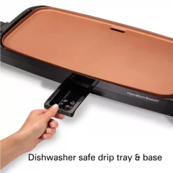 The unique design the Hamilton Beach Reversible Durathon Ceramic Griddle lets you connect the power cord from either side, making it convenient enough to make breakfast foods, toasted sandwiches and more anytime, anywhere. Made with Durathon ceramic, this griddle provides you with superior nonstick performance. The heat is adjustable for a greater range of cooking options. And you can make a whole meal with little fuss thanks to the large 200 sq. in. cooking surface.
