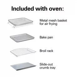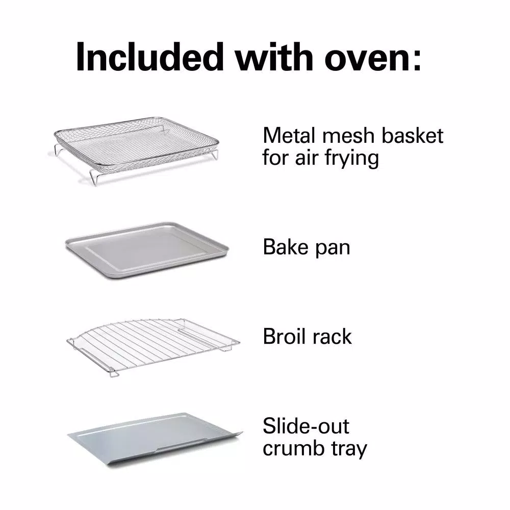 - Includes metal basket for air frying, bake pan, broil rack and slide-out crumb tray