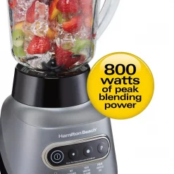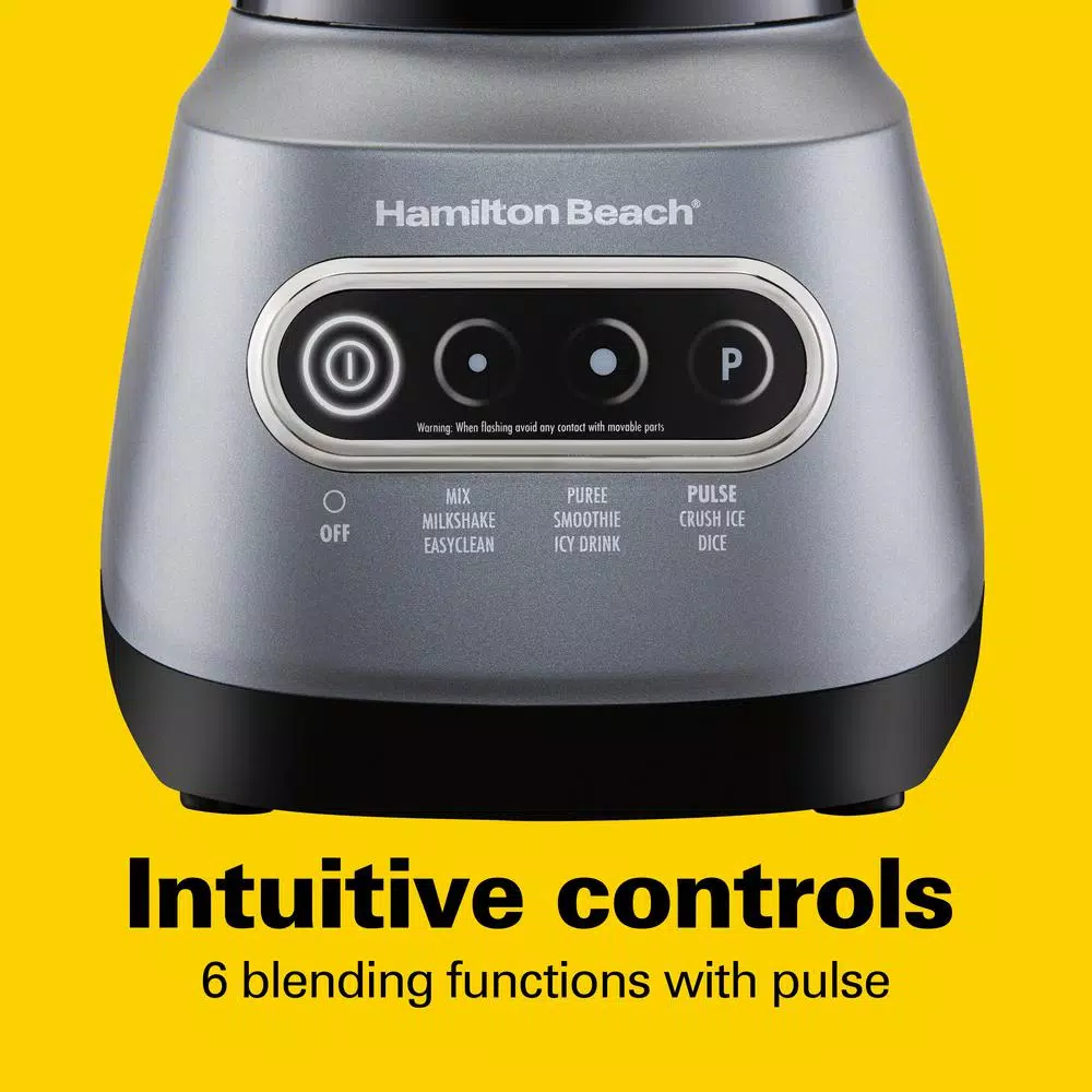 If you need the versatility of a large blender but love the flexibility to blend and run, the Hamilton Beach Wave Crusher Blender is the perfect solution. The base fits both the 40 oz. blending pitcher and an included 20 oz. blending jar that you can take on the go. Now its easy to make a smoothie or milkshake for one, or the entire family. The 800 watt peak power motor and ice-crushing stainless steel blades produce ultra-smooth fruit smoothies, shakes and icy drinks. 6 blending functions plus pulse and intuitive controls make it easy to achieve the consistency you want. Other thoughtful innovations include a unique spout that pours without messy drips and a patent-pending design that reduces noise from the motor. When itβs time for cleanup, the blades and jars are removable and dishwasher safe.