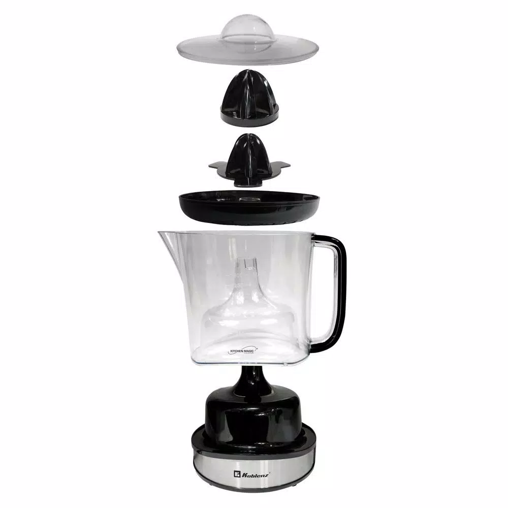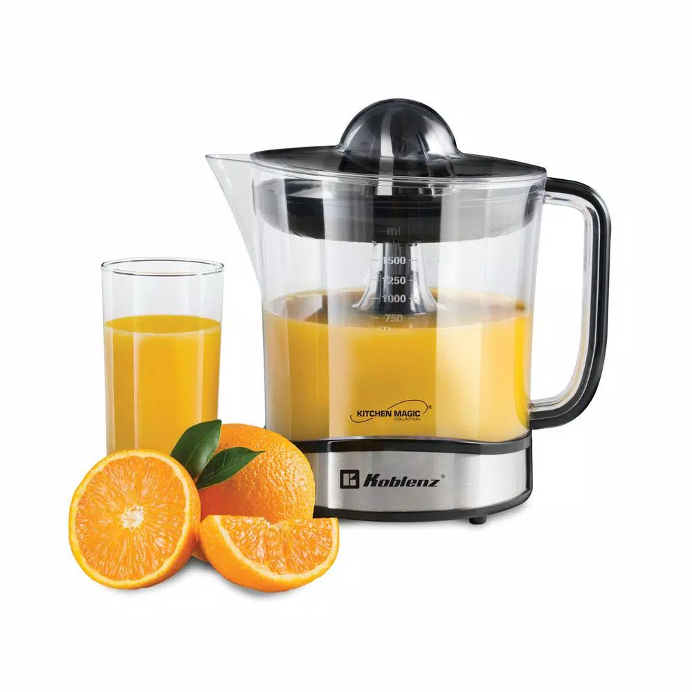Easily make fresh juice at home with the 1.5 Liter Koblenz Kitchen Magic Collection Citrus Juicer. Juice oranges, lemons, limes, and more. The small and large cone extracts the maximum amount of juice. The detachable jug lifts off the base for immediate serving.
