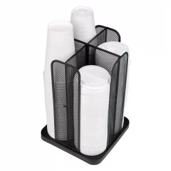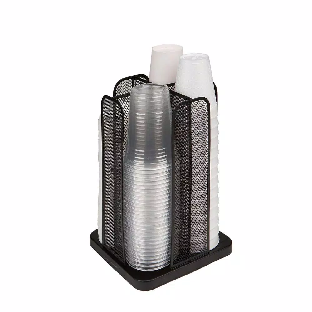 - DISPOSABLE COFFEE CUP/LID STORAGE CAROUSEL: Vertical cup and lid tower spins a full 360 degrees and offers 4 compartments for stacking 10oz, 12oz and 16oz cups and lids โ holds up to 80 cups with 20 in each compartment.