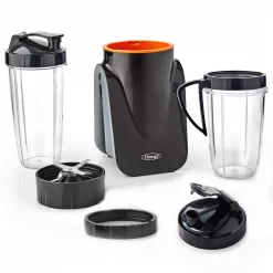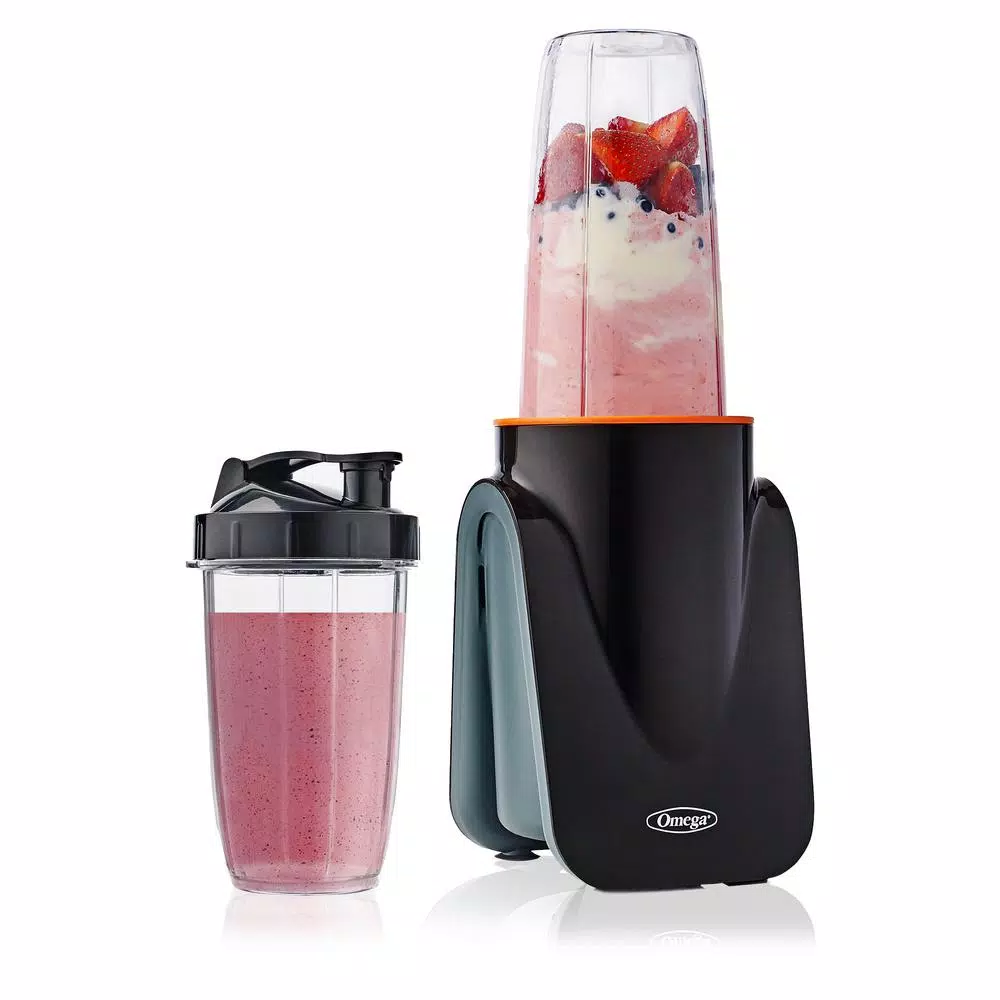 - This 8-piece set includes: one 1000-Watt motor base, one 6-prong stainless steel blending blade, one 32 oz. cup, one 27 oz. cup, 2-flip top lids, 1-handle ring, 1-comfort lip ring