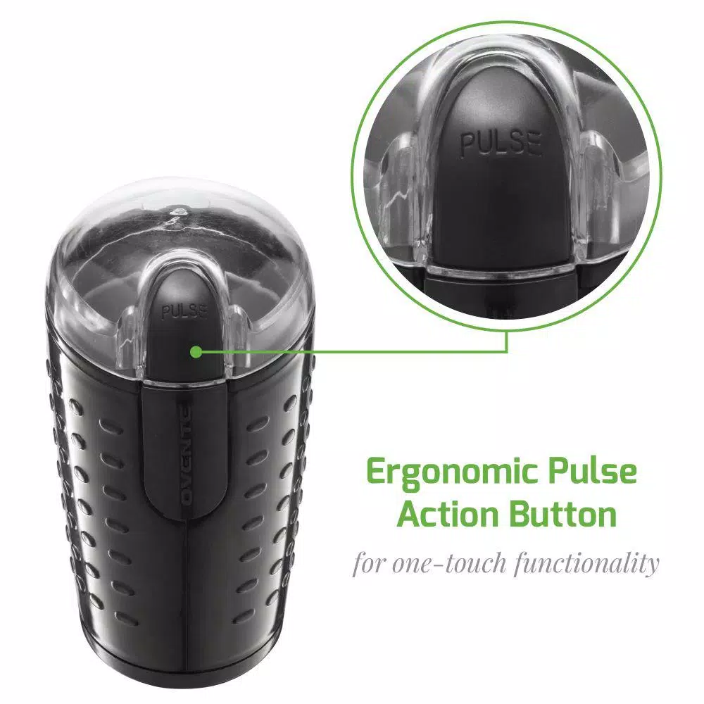 The Ovente Electric Grinder reinvigorates luscious flavors and aroma from ground coffee, tea leaves, herbs, spices, nuts, grains and so much more. Equipped with 150-Watt motor power, the Ovente Electric Grinder can pulverize and grind whole coffee beans into a freshly-ground powder within seconds. The high-quality stainless steel blades pave way for a better and smoother grind. Its stainless steel grinding bowl (hopper) holds up to 2.5oz (70g) of aromatic and flavorful ground products. The ergonomic oval structure of the body was carefully designed for easy gripping, making accidental slips a thing of the past. * Key Features: β’ 120V, 150-Watt low-noise motor for fast and powerful grinding while preserving the complex, aromatic flavors of your grind. β’ Ergonomic pulse action button for one-touch functionality β’ Discreet cord storage β’ Transparent EasyOpen lid gives you complete control over your grind β’ 2.5oz (70 grams) Stainless steel capacity β’ Comfortable oval-shaped body with ridges for easy grip β’ Stainless steel blades pulverize with precision from whole to coarse/fine grounds β’ Perfect for coffee beans, tea leaves, herbs, spices, nuts, grains, and more.
