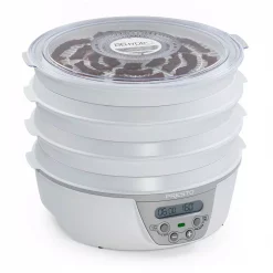 Dehydrate fruits, vegetables, herbs and spices, as well as make great-tasting jerky and fruit rolls. This deluxe digital dehydrator includes six drying trays, expandable to 12 trays for added drying capacity. The drying trays nest when not in use for over a 40% reduction in storage space. Dehydration maintains natural vitamins and minerals-with no additives or preservatives. Make homemade jerky using your choice of meat, poultry, or seafood. Includes starter packs of jerky spice and cure. Also included are two Fruit Roll Sheets for making healthy fruit rolls and strips from fresh, frozen, or canned fruit and two Non-stick Mesh Screens for drying small and sticky foods. The digital timer and thermostat provide precise drying times and temperatures that range from 90Β‘ to 165Β‘ F. The Bottom mounted fan and heating element provide consistent air flow for optimum drying with no tray rotation necessary. A See through cover on the top tray lets you monitor drying progress. Drying trays and cover are fully immersible and dishwasher safe. Accessories sold separately. Additional Drying Trays, Fruit Roll Sheets, Non-stick Mesh Screens and Jerky Seasoning sold separately. Jerky Gun is also available.